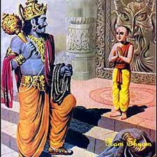 The story of Yama and Nachiketa is the conversation between a young boy, Nachiketa and the Lord of Death – Yama. Nachiketa was the son of a sage named Vajashravas who was performing a yagna in which he had to give all his possessions as a mark of detachment. All the old and sick cattle were given away by Vajashravas. Nachiketa, who was minutely observing this, thought that his father who was deeply attached to him, should also give him away as part of the yagna. When Nachiketa inquired his father to whom he would be given, his father irritatingly replied that he would give him to the Lord of Death, Yama. Immediately, he realized his mistake and his heart was full of remorse. But when he looked at Nachiketa, he was calm and composed. He began his journey towards the realm of death and finally reached Yama’s abode. As Yama was not there, Nachiketa waited outside the door for three days without food and water. When Yama arrived and came to know that a young boy of twelve years had waited for him for such a long duration, he apologized to him and offered him three boons.